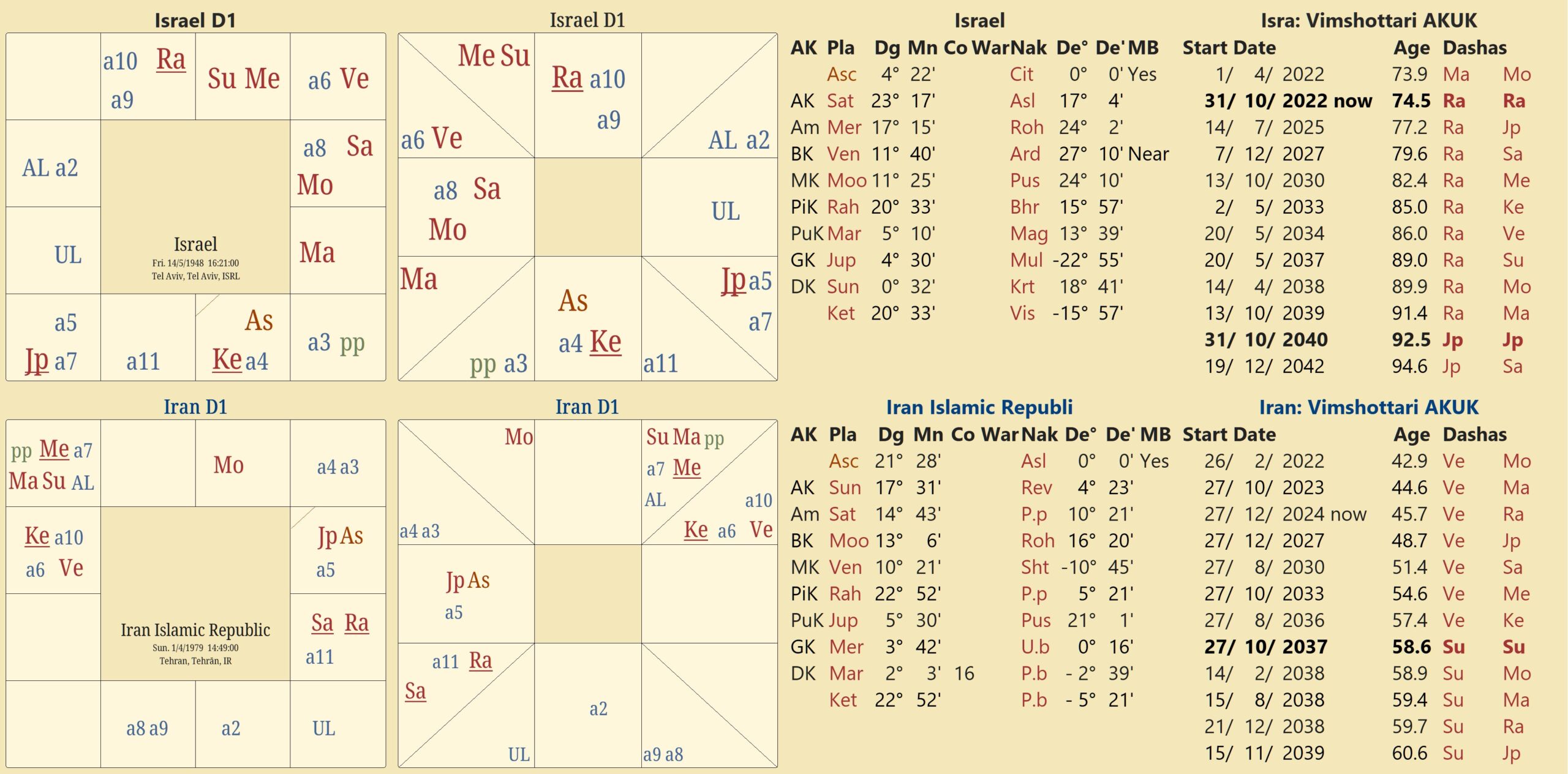 Interesting that both nations are under Rāhu antardaśā and are fighting a war. Israel is karkaṭa rāśi ♋ and Iran is vṛṣabha ♉. Normally this is a good match for marriage, as it is a 3/11 relationship bringing in much fun and frolic. Then why this aggression? For both janma rāśi one planet that can cause terrible issues is Rāhu. Think of two very fine ladies, one ruled by Moon (Israel mama) and the other ruled by Venus (Iranian beau). Rāhu has put some doubt about Venus trying to take over then throne of mama Moon. Mama gives a spanking – there are lots of arguments with pots, pans and knives thrown at each other.